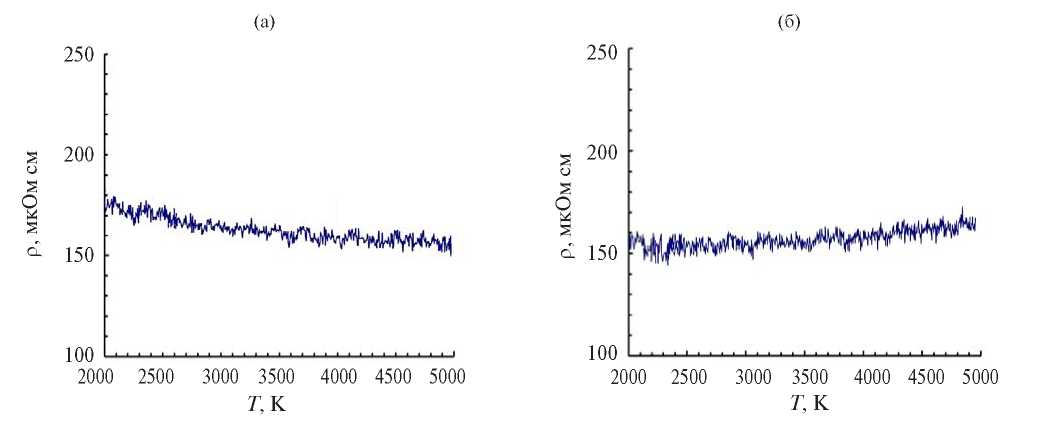 Наблюдается отличие эксперимента при повышенном давлении (рис. 4б) от эксперимента при малом давлении(рис. 4а): 1) при Тпл = 2504 К сопротивление несколько ниже, чем на рис. 4а; 2) на рис. 4б виден слабый рост сопротивления во всем диапазоне температур в отличие от слабого падения на рис. 4а.