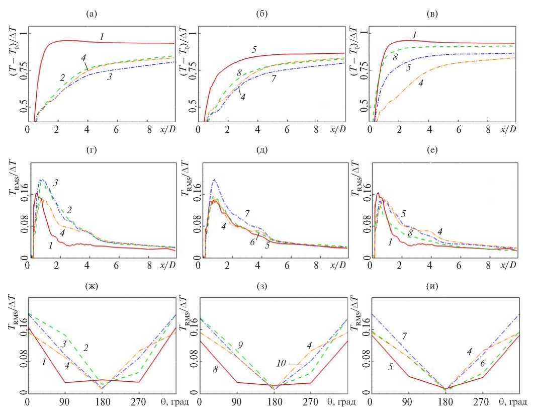 Рис. 10. Влияние параметров φ и L/D на распределения средней температуры (a)–(в) и ее среднеквадратичного отклонения (г)–(е) вдоль линии z = 0.5 в плоскости y = 0, а также на азимутальные распределения максимальных среднеквадратичных отклонений температуры (ж)–(и): 1 – L/D = 1, φ = 0°; 2 – 1, 90°; 3 – 1, 180°; 4 – прямая конфигурация; 5 – 4, 0°; 6 – 4, 90°; 7 – 4, 180°; 8 – 2, 0°; 9 – 2, 90°; 10 – 2, 180°.