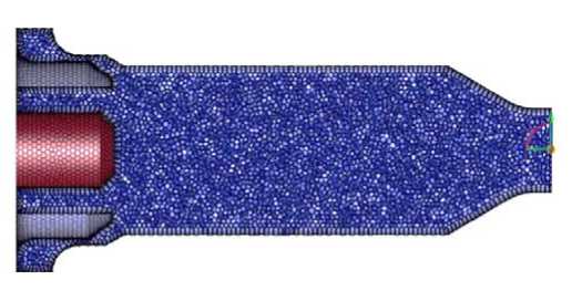 Расчет течения в вихревой камере сгорания СВЧ-воспламенителя проводился с помощью готовых коммерческих программных продуктов в две стадии: «холодный» расчет (без горения ПГ) и «горячий» расчет (с горением ПГ). «Холодный» расчет проводился для определения степени закрутки потока в характерных сечениях (рис. 3) и статического давления в характерном сечении замера вихревой камеры сгорания (сечение Р3 на рис. 3), а также для оценки гидравлических потерь и импульса, создаваемого «холодным» потоком при заданных массовых расходах компонентов топлива. Граничные условия в виде массовых расходов ПГ и воздуха задавались в соответствии с результатами экспериментов. Конечно-объемная модель вихревой камеры сгорания представлена на рис. 4. Она включала в себя 392508 элементов, тип элементов – додекаэдр.
