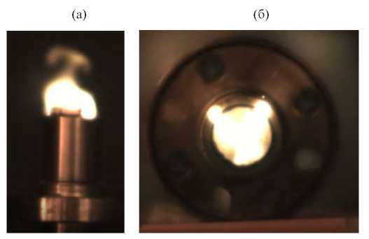 Рис. 8. Фотографии плазменного факела СВЧ-воспламенителя: (а) – вид сбоку, (б) – вид сверху.