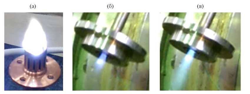 Длительность существования плазмы определяется длительностью импульса модуляции, которую можно изменять в пределах от 8 до 200 мс. Энерговклад при этом зависит от длительности импульса. При автономных испытаниях была выбрана длительность рабочего импульса 70 мс, длительность периода – 350 мс. Потребляемая мощность от сети составляет 200 Вт, напряжение питания СВЧ-свечи – 4 кВ. При подаче переменного напряжения от сети 220 В на агрегат зажигания через 4–5 с на головной части СВЧ-свечи появляются факелы плазмы (рис. 9а). Предварительно при отработке работоспособности СВЧ-свечи в составе с воспламенителем проводились автономные испытания воспламенителя. Последовательность запуска воспламенителя следующая: 1) в камеру сгорания СВЧ-воспламенителя тангенциально подаются раздельно воздух и ПГ в соотношении, близком к стехиометрическому; 2) через секунду включается СВЧ-свеча; 3) воспламенитель запускается и работает в заданном режиме; 4) выключается СВЧ-свеча; 5) прекращается подача воздуха и ПГ в камеру сгорания СВЧ-воспламенителя. При визуальном контроле при первом включении СВЧ-свечи наблюдался факел светящихся продуктов сгорания, истекающих из канала воспламенителя. При выключении свечи факел воспламенителя продолжал гореть в устойчивом режиме (рис. 9б). Включение СВЧ-свечи при работающем воспламенителе заметно увеличивало светимость факела (рис. 9в). Это обусловлено дополнительным энергоподводом и смещением граничных пределов горения топливовоздушной смеси, неоднородной по процентному содержанию топлива вследствие повышенной ионизации.