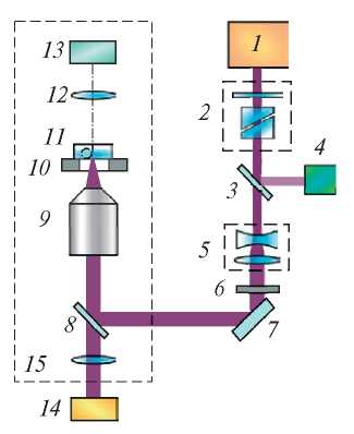 Рис. 1. Схема экспериментальной установки: 1 – пикосекундный лазер; 2 – узел ослабления лазерного излучения; 3 – стеклянная пластина; 4 – фотодиод; 5 – узел телескопа; 6 – механический прерыватель лазерного излучения; 7, 8 – зеркала на длину волны лазерного излучения; 9 – микрообъектив; 10 – моторизованный предметный столик; 11 – чашка Петри с эмбрионами; 12 – конденсор микроскопа; 13 – осветитель; 14 – видеокамера; 15 – инвертированный микроскоп.