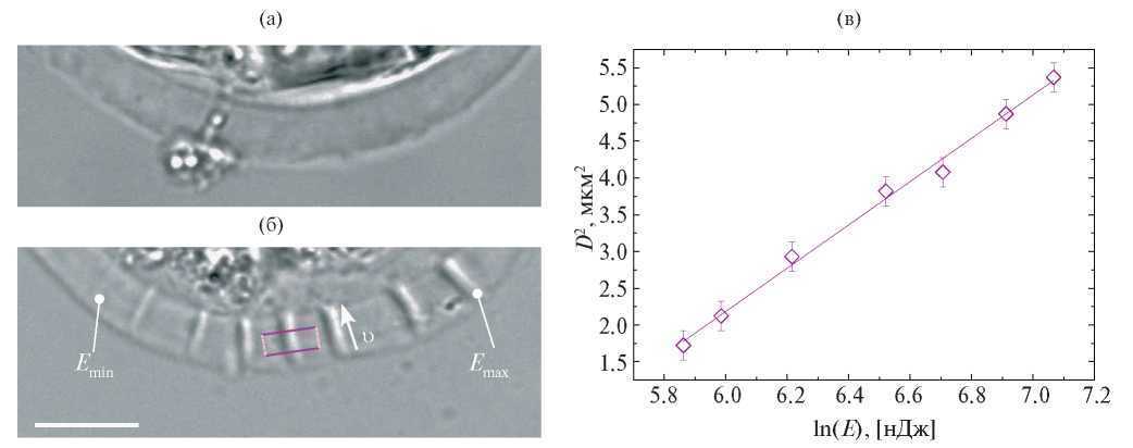 Рис. 3. Микрофотографии эмбриона после оптического пробоя в ZP (а) и фрагмента блестящей оболочки эмбриона (б) после выполнения микрохирургии (υ = 0.0005 мм/с, f = 2.5 кГц); Emin = 0.3 мкДж, Emax = 1.17 мкДж, масштаб – 25 мкм, прямоугольником отмечена область для построения профилей сечения; (в) – зависимость (2) квадрата ширины надреза D 2 от логарифма энергии пикосекундных лазерных импульсов ln(E).