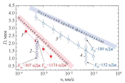 Рис. 4. Зависимость ширины надреза блестящей оболочки от скорости лазерного пучка D(υ) при f = 2.5 кГц: 1 – D(υ), воздействие при Eps= 1174 нДж; 2 – D(Eps*) при υ = 0.0005 мм/с, Eps* = 307, 353, 390, 501, 680, 819, 1005, 1174 нДж; 3 – D(υ), Efs = 174 нДж, данные [26], 4 – D(Efs**) при υ = 0.01 мм/с, Efs** = = 152, 159, 167, 174, 189 нДж [26].