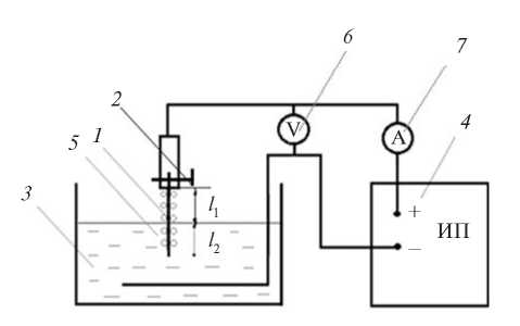 Рис. 1. Экспериментальная установка: 1 – медицинская игла, 2 – медное крепление, 3 – электролит, 4 – источник питания, 5 – пузырьковая среда в электролите в процессе горения электрического разряда, 6 – вольтметр, 7 – амперметр.