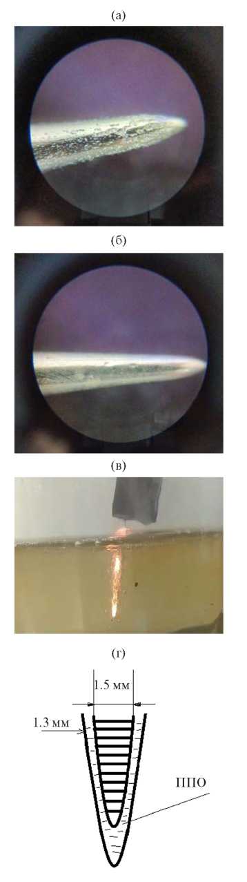 На поверхности необработанной стальной иглы из нержавеющей стали наблюдаются шероховатости (рис. 3а). На рис. 3б приведена фотография полированной поверхности медицинской иглы. Обработка производилась электрическим разрядом постоянного тока в электролитно-пузырьковой среде раствора сульфата аммония в водопроводной воде при атмосферном давлении, l1 = 5 мм и концентрации электролита 1.5%. Очистка и полировка поверхности происходит за время от 5 до 10 с. При этом конец иглы притупляется в зависимости от концентрации и состава электролита. Полировка поверхности происходит благодаря электрическому разряду, который образуется вдоль стальной иглы. В процессе полировки на поверхности иглы образуется плазменно-пузырьковая оболочка (ППО), как показано на рис. 3в и 3г. Между иглой и ППО горят микроразряды. Аналогичные микроразряды наблюдаются также в процессе обработки, когда торец электрода находится вне электролита. Фотографии поверхностей иглы до и после полировки сделаны через оптический микроскоп.