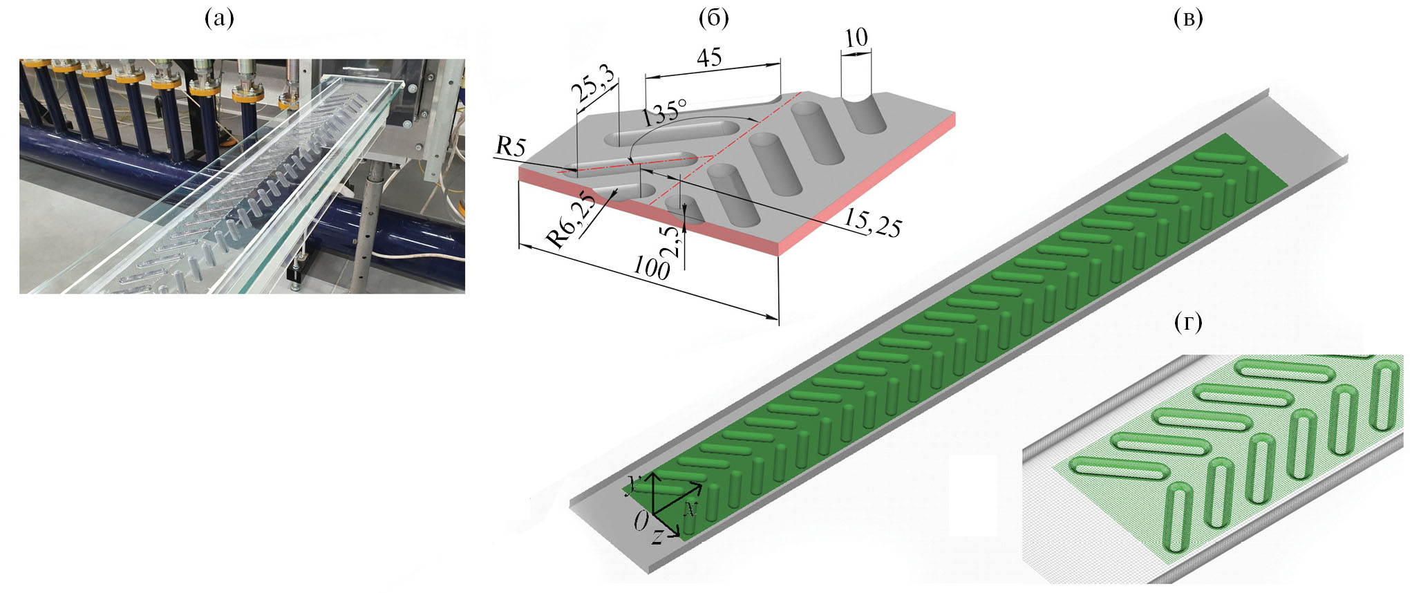 Исследования выполнены в оптически прозрачном канале высотой 0.01 м, шириной 0.1 м и длиной 0.8 м (рис. 1а). Нижняя стенка канала представляла собой вкладыш из поликарбоната, на поверхности которого отфрезерованы наклонные канавки. Геометрия поверхности показана на рис. 1б. Количество канавок в одном ряду – 26.