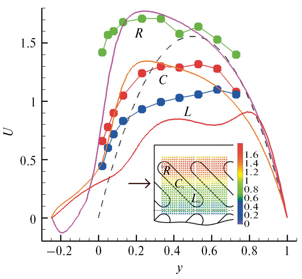 Проведенные методом SIV [22] замеры полей скорости в окрестности 22-й канавки (цветная картина приведена на рис. 2) удовлетворительно согласуются с численными решениями уравнений Навье–Стокса, полученными с помощью пакета VP2/3 [24]. Измеренные профили скорости U(y) в трех характерных точках L, C, R канавки при Re = 1000 показывают значительное преобладание U в пристеночных зонах канала, доходящей до величин порядка 1.7 (при у = 0.3) по сравнению с приосевой областью, где U снижается до 1.1 (у = 0.65). Обращает на себя внимание утончение и интенсификация пристеночного течения над входной частью 22-й канавки с достижением U на уровне у, близком к нулю, величины 1.4. В середине канавки и над выходной ее частью на этом уровне U оказываются значительно ниже по величине и составляют 0.65 и 0.4.