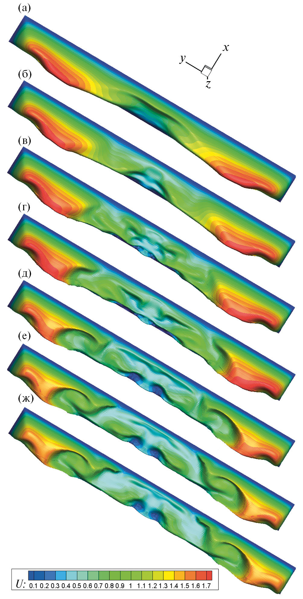 Трансформация профиля скорости U(z) поперек канала в районе 22-й канавки на высоте у = 0.4 (рис. 6г) демонстрирует влияние Re на профиль продольной скорости в ядре канального потока. Равномерный поток на входе в канал по мере приближения к его концу приобретает сдвиговый характер с двумя максимумами скорости вблизи боковых стенок и минимумом в срединной плоскости. Как уже отмечалось при анализе рис. 3, с ростом числа Рейнольдса профиль скорости U(z, y) в поперечном сечении 22-й канавки изменяется в центральной приосевой части канала. Распределения U(z) на высоте у = 0.4 сохраняют симметрию по координате z, но при возрастании Re приобретают локальные максимумы и минимумы (начиная с Re = 1500). При Re < 2500 образуются два максимума и два минимума, а для Re > 3500 их число удваивается. Пристеночные максимумы до Re = 2500 остаются неизменными (порядка 1.7), а в дальнейшем несколько снижаются до 1.6. Протяженность этих максимумов по мере роста Re уменьшается, однако в диапазоне Re от 3500 до 5500 происходит их стабилизация. Короткая зона минимальной (порядка 0.5) скорости U в центре канала практически от числа Re не зависит.