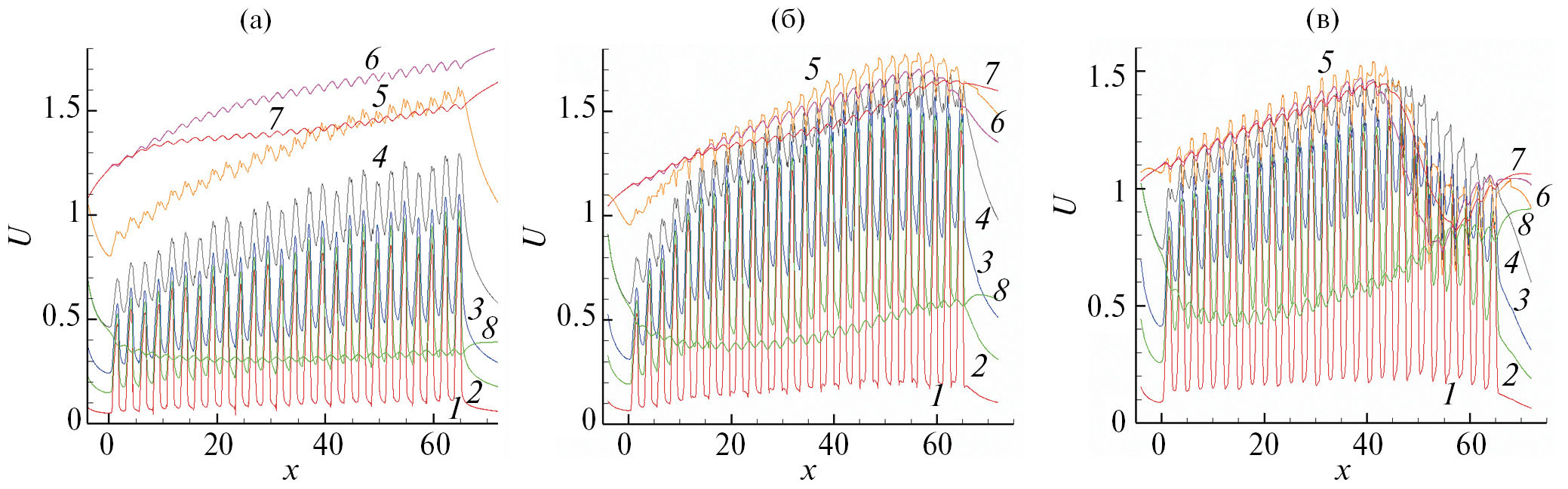 Рис. 5. Распределения скорости U в продольном сечении канала z = –3.245, иллюстрирующие локальное ускорение потока в ядре по мере отхода от входного сечения и проходящего через центры сечений стыковки сферических сегментов и цилиндрических траншей R, при Re = 1000 (а), 2500 (б), 5500 (в) и различных у: 1 – y = 0.005, 2 – 015, 3 – 0.025, 4 – 0.05, 5 – 0.1, 6 – 0.4, 7 – 0.6, 8 – 0.95.