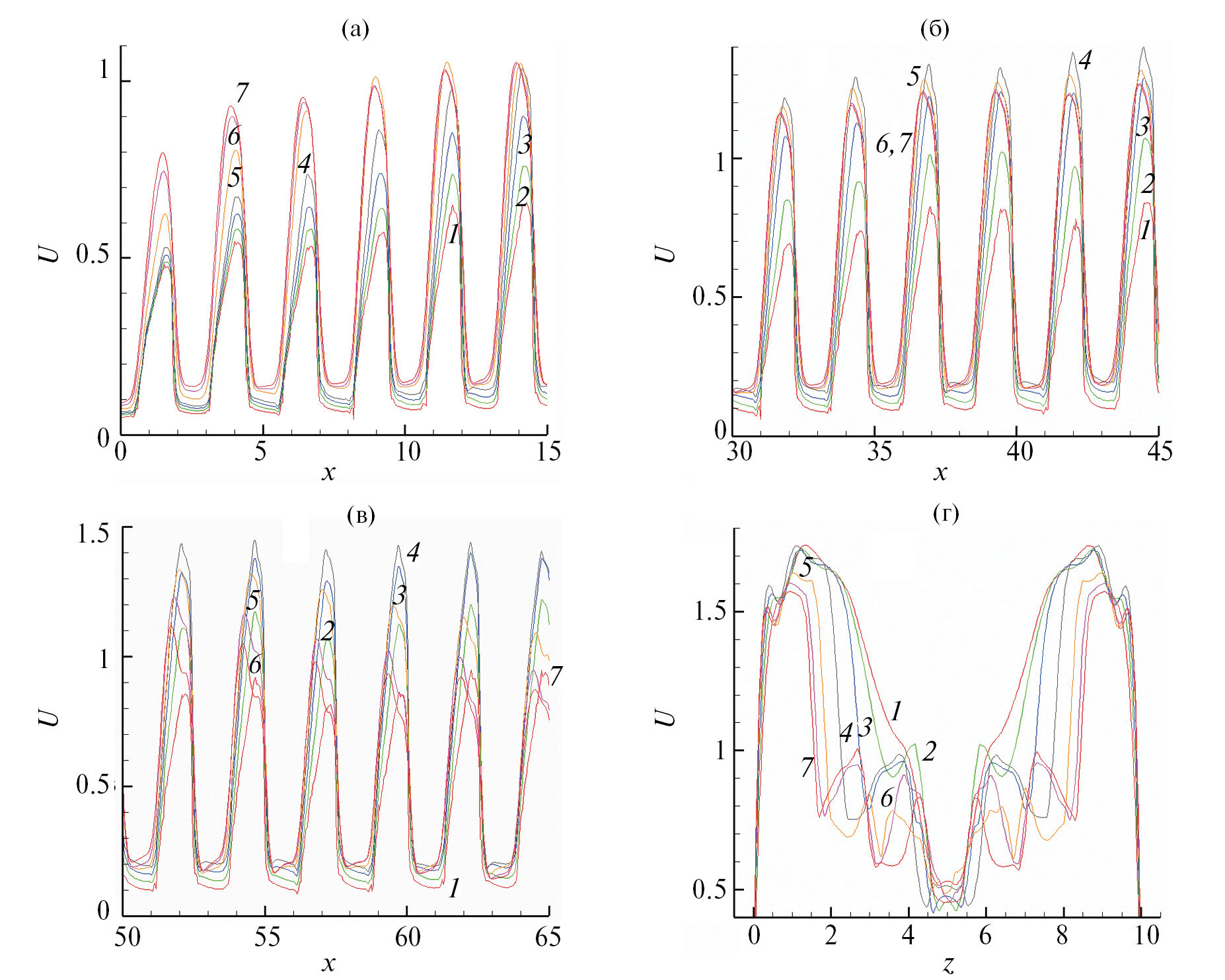 Рис. 6. Влияние Re на ускорение потока в канале при сравнении продольных распределений U-компоненты скорости при у = 0.005 в сечении с координатой точки R (см. рис. 3), z = -3.245 (а)–(в) и поперечных распределений в районе 22-й канавки при x = 55.5 и y = 0.4 (г): 1 – Re = 1000, 2 – 1500, 3 – 2000, 4 – 2500, 5 – 3500, 6 – 4500, 7 – 5500.