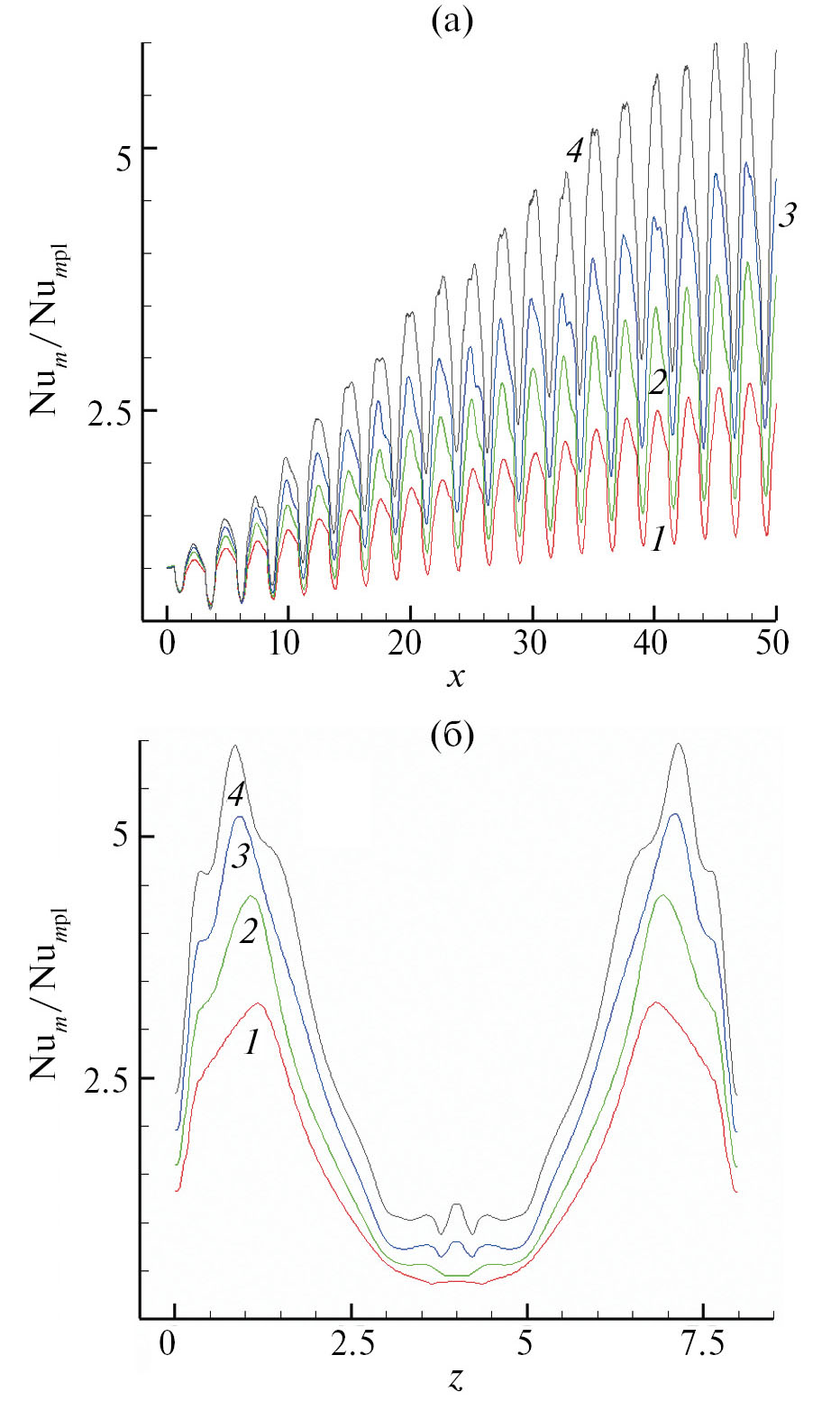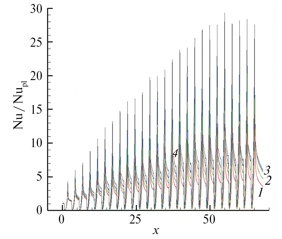 Локальное число Нуссельта на структурированной нагретой стенке определяется по нормальному градиенту температуры, отнесенному к разнице между температурой стенки и среднемассовой температурой в сечении канала, согласно описанной в [32] методике. Циклическое увеличение относительной теплоотдачи Nu/Nupl по длине канала в продольном сечении входных участков канавок при z = –3.245 значительно усиливается по мере роста Re (на рис. 8 показаны кривые 1–4 для Re = 1000–2500). Максимумы относительной теплоотдачи на наветренных кромках канавок быстро увеличиваются и приближаются к стабилизации в конце канала. Для Re = 2500 (Nu/Nupl)max возрастают от 4 до 28. Внутри канавок на подветренных сторонах наблюдается резкий провал Nu/Nupl до уровня, не превышающего 0.3 в конце канала. В промежутках между канавками относительная теплоотдача уменьшается, но ее средний уровень растет по длине канала, достигая величин порядка 7 для Re = 2500.
