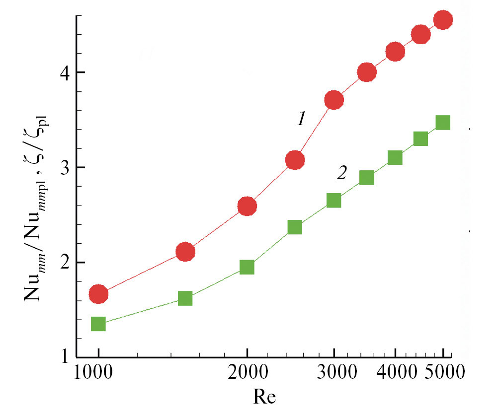 Рис. 10. Влияние Re на рост относительной теплоотдачи Numm / Nummpl (1) на структурированной стенке канала и увеличение относительных гидравлических потерь ζ / ζpl (2) в канале.