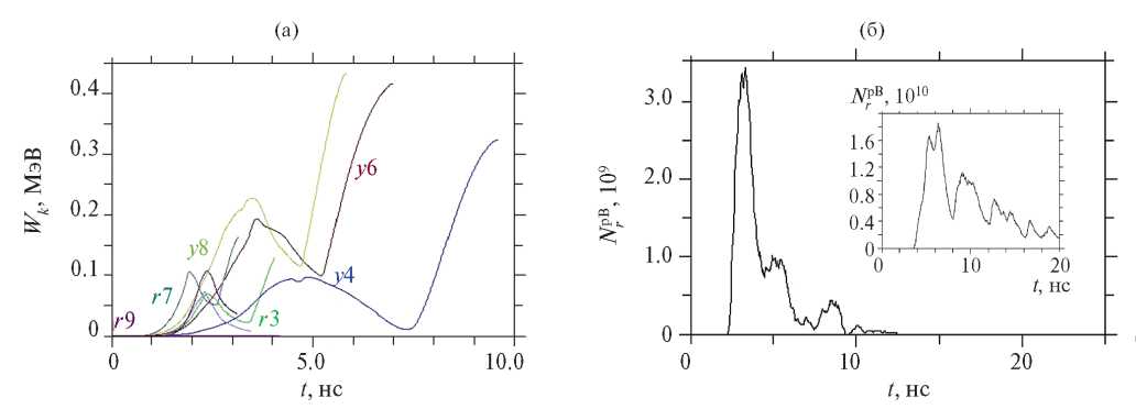 Рис. 3. Энергии (а) случайно выбранных различных групп протонов (r) и ионов бора (y) во времени для геометрии А–К, использованной в эксперименте [23]; (б) – выход вторичных α-частиц в зависимости от времени (п.е.) для геометрии А–К, использованной в эксперименте (рис. 1а); на вставке – выход α-частиц при хорошо определенных осцилляциях ионов в потенциальной яме (PiC-моделирование [23]).
