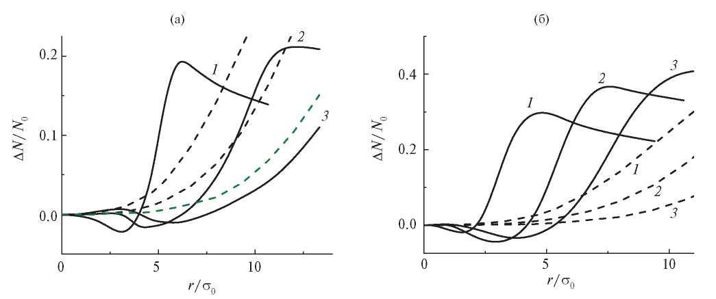 Рис. 1. Зависимость ∆N / N0 от r / σ0 при различных значениях β и t /τexp: 1 – t /τexp = 2.5, 2 – 5.0, 3 – 7.5: сплошные линии – β = 6.7 (а) и 38 (б); штриховые – β = 0, σ0 = 0.015 (а) и 0.087 см (б).