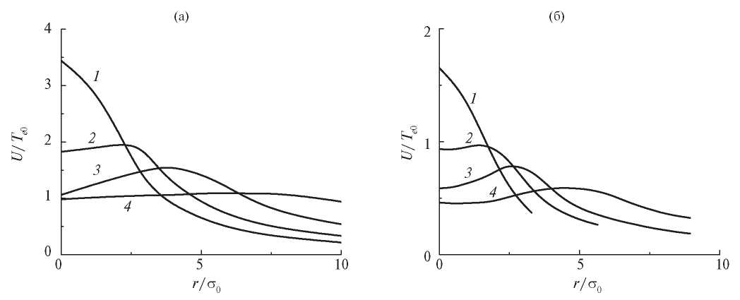 Рис. 2. Зависимость ионной потенциальной энергии U / Te0 от r / σ0 для различных значений β и t /τexp: (а) – β = 6.7, 1 – t /τexp = 0.10, 2 – 0.25, 3 – 0.50, 4 – 1.50; (б) – β = 38, 1 – t /τexp= 0.5, 2 – 1.5, 3 – 2.5, 4 – 5.0.