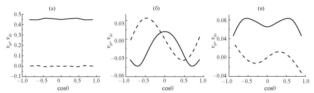 Рис. 4. Зависимость радиальной vir = τexpvir / r (сплошная линия) и поперечной vi θ = τexpvi θ / r (штриховая) ионных скоростей от cosθ при β = 38 и r / σ0 = 1.25: (a) – t /τexp = 1, (б) – 5, (в) – 8.