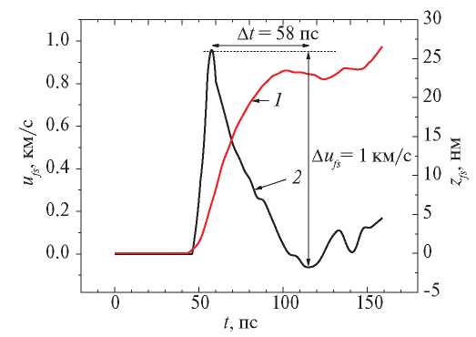 На рис. 2 представлена эволюция скорости движения тыльной поверхности пленки ванадия ufs(t) вблизи порога откола при плотности энергии F = 0.72 Дж/см2. Смещение поверхности zfs(t) связано с изменением фазы ∆ϕ(t) соотношением zfs(t) = ∆ϕ(t)λ/4π. Профиль скорости ufs(t) получен в результате дифференцирования экспериментальной зависимости смещения zfs(t). Нулевой момент времени на графике выбран произвольно.
