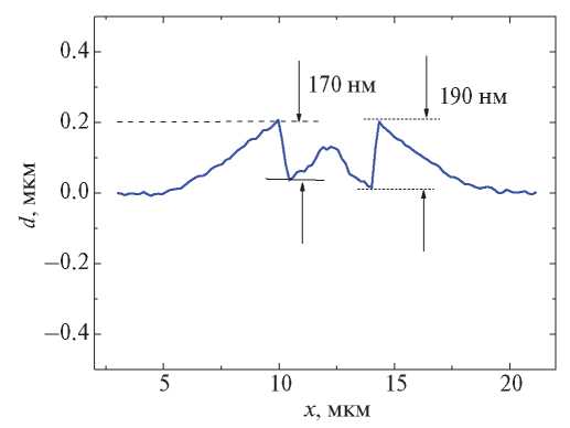 Из рис. 3 и 4 следует, что диаметр откольного разрушения составляет примерно 3 мкм при глубине около 170–190 нм. На поверхности вне кратера наблюдаются отдельные дефекты размером до 500 нм, обусловленные особенностями процесса напыления. Также вероятно, что наряду с дефектами на поверхности после воздействия могли осаждаться продукты откольного разрушения. Однако вопрос исследования продуктов разрушения выходит за рамки настоящей работы и детально не изучен.