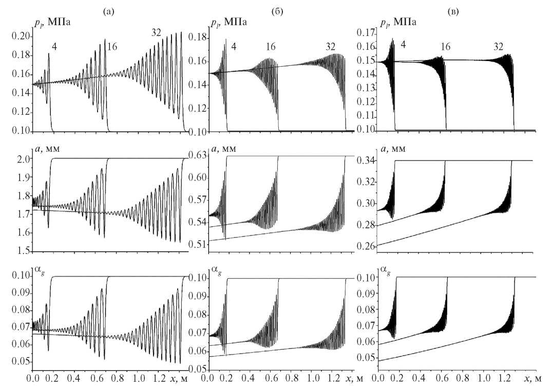 Рис. 7. Эпюры волн давления (верхний ряд), радиуса пузырька (средний ряд) и объемного газосодержания (нижний ряд) в коническом канале: (а) – без учета дробления пузырьков и при отсутствии в системе ПАВ, (б) – с учетом дробления пузырьков только из-за сужения канала, (в) – при дроблении пузырьков и добавлении в среду ПАВ; числа у кривых – моменты времени в мс.