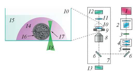 Рис. 1. Схема экспериментальной установки: 1 – фемтосекундный лазер, 2 – поляризационный ослабитель, 3 – кристалл DKDP, 4 – телескоп, 5 – механический прерыватель лазерного излучения, 6 – зеркала на длину волны лазерного излучения, 7 – инвертированный микроскоп, 8 – микрообъектив, 9 – моторизованный предметный столик, 10 – чашка Петри с эмбрионом, 11 – конденсор микроскопа, 12 – осветитель, 13 – видеокамера, 14 – капля питательной среды, 15 – минеральное масло, 16 – эмбрион, 17 – экваториальная плоскость, 18 – лазерный луч.