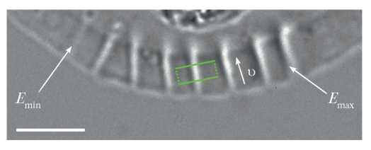 Рис. 2. Микрофотография фрагмента блестящей оболочки эмбриона после выполнения микрохирургии при различной энергии лазерных импульсов (υ = 0.01 мм/с, f = 2.5 кГц); Emin = 30 нДж, Emax = 68 нДж; масштабная линейка – 25 мкм; прямоугольником отмечена область для построения профилей сечения.