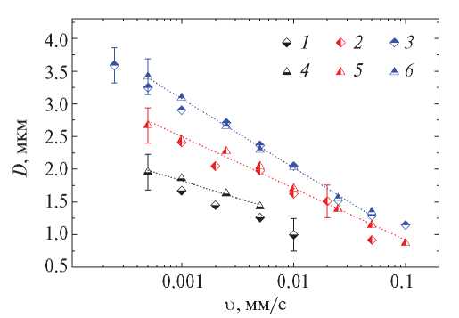 Рис. 3. Зависимости ширины надреза ZP от скорости лазерного пучка D(υ) при различных значениях интенсивности I: 1 – свежие эмбрионы, I = 1.4 ТВт/ см2; 2 – 2; 3 – 2.75; 4 – крио-эмбрионы, I =1.3 ТВт/см2; 5 – 2.4; 6 – 2.8.