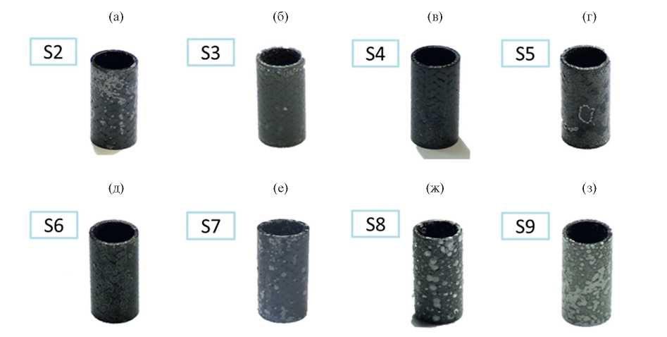 16. Fig. 15. Photographs of samples oxidized at 1600 °C and different partial pressures of water vapor [170]: (a) – 10 kPa, 16 h, maximum flow – 66 l/h; (b) – 60, 22, 64; (c) – 30, 22, 64; (d) – 60, 22, 133; (d) – 30, 25, 133; (e) – 30, 22, 133; (g) – 60, 64, 64; (h) – 60, 22, 133.