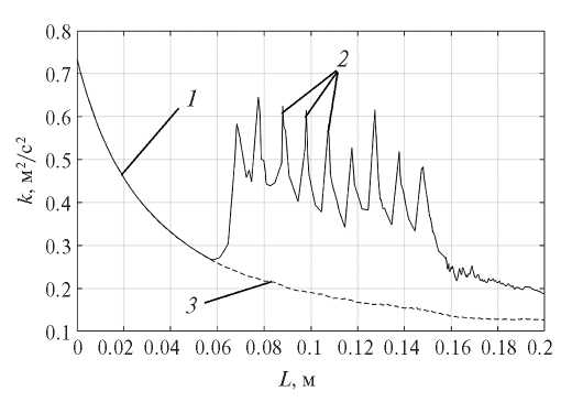 Рис. 3. Распределение энергии турбулентности k по длине канала: 1 – начальный участок с повышенной k, 2 – рост k за отдельными частицами, 3 – «квазистационарное» однофазное течение.