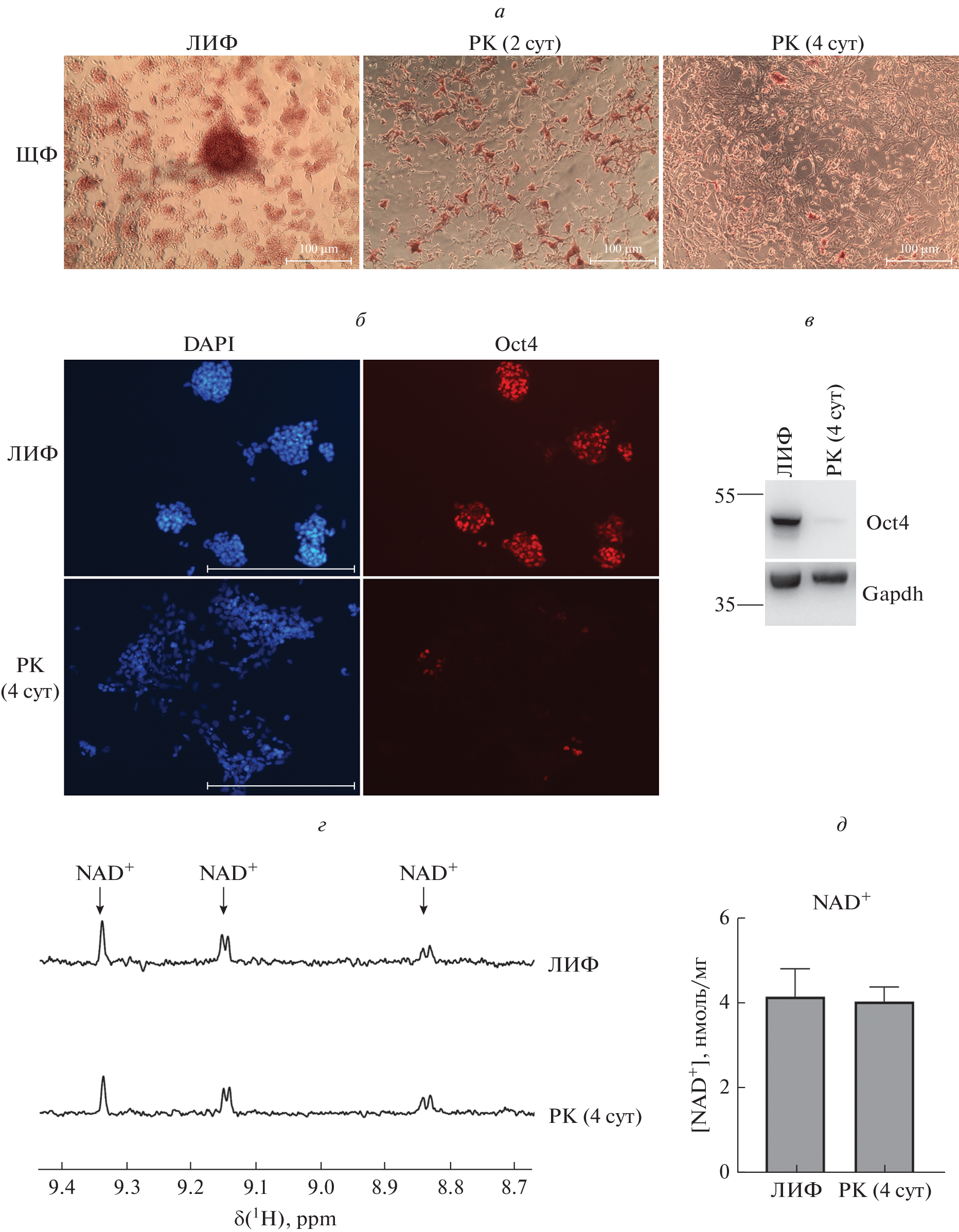 Nicotinamide adenine dinucleotide (NAD+) plays a key role in cellular metabolism and signaling. In recent years, evidence has accumulated that NAD+-dependent processes are involved in the regulation of pluripotency and differentiation of mammalian embryonic stem cells. The major means to maintain NAD+ levels in mammalian cells is through its biosynthesis from various forms of vitamin B3. In this study, we examined how stimulation and inhibition of NAD+ biosynthesis affect the maintenance of the pluripotency of mouse embryonic stem cells E14 Tg2a (E14 cells). The pluripotency status of E14 cells was assessed by immunocytochemical and immunoblotting analysis using antibodies to the pluripotency factor Oct4, as well as by staining for alkaline phosphatase. Using NMR spectroscopy, we have found that the concentration of NAD+ in pluripotent E14 cells cultured in the presence of LIF is about 4 nmol/mg, and it remains unchanged after induction of differentiation with retinoic acid. We have also demonstrated that pharmacological stimulation of NAD+ biosynthesis by nicotinamide riboside increases the level of intracellular NAD+ by 20%, but it does not affect the maintenance of pluripotency in E14 cells. Moreover, under conditions of critical depletion of NAD+ pool by Nampt inhibition with FK866 E14 cells maintained pluripotency, though the expression level of Oct4 was decreased.