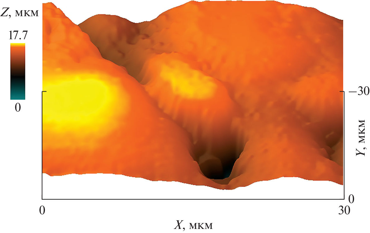 A two-section analytical system was developed and tested to study the culture of EA.hy926 endothelial cells in real time with high resolution imaging. Scanning ion-conductance microscopy was shown as more relevant method because it didn’t cause mechanical damage of cell, and made possible scanning on the membranes, when endothelial cells were surrounded by nutrient medium. The method allowed not only to analyze changes in the cells morphology, but also to identify extracellular (microfilaments) and intracellular (nucleolus) structures. The rigidity mapping showed that the rigidity of the endotheliocyte membrane varied from 357 to 796 Pa. After 240 min from the beginning of the observation, the formation of endothelial cells apoptotic bodies has begun, and the rigidity of the cell gradually increased, while rigidity of the apoptotic bodies decreased.