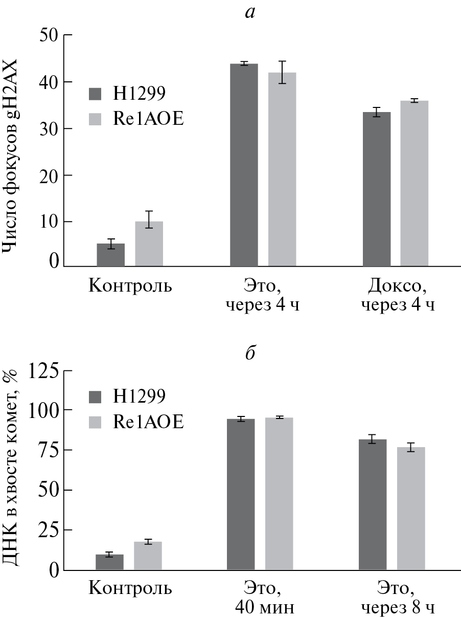 Рис. 4. Оценка эффективности репарации разрывов ДНК в клетках линий H1299 и H1299 RelAOE: a — среднее число (и его ошибка) фокусов гистона γH2AX в ядре. Клетки обрабатывали этопозидом (Это) или доксорубицином (Доксо) в течение 40 мин, после чего препарат удаляли и культивировали еще 4 ч; б — результаты теста ДНК-комет в щелочных условиях. Обработку клеток этопозидом проводили, как описано ранее, с последующим культивированием в отсутствие препарата в течение 8 ч. Контроль — интактные клетки