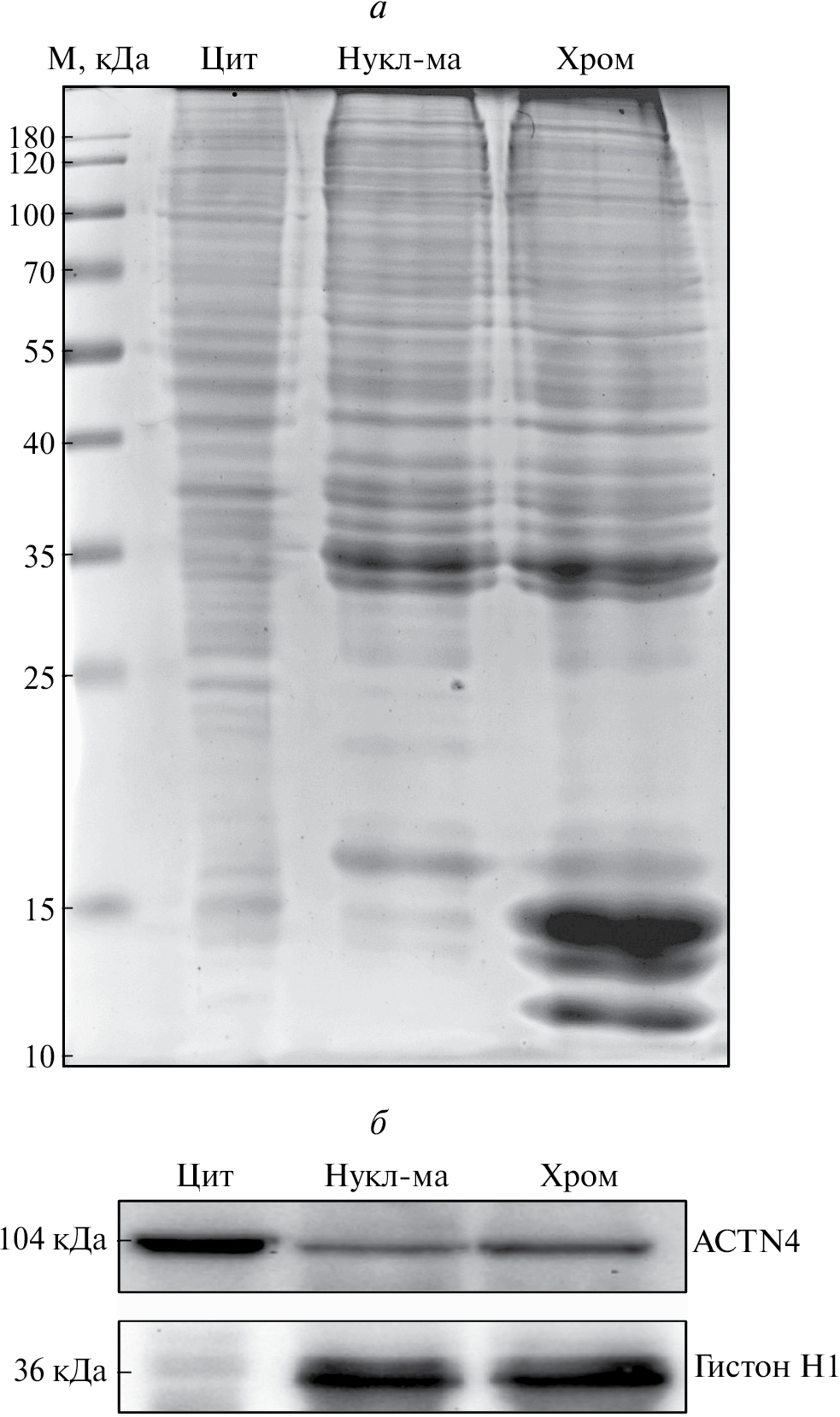 Рис. 5. Распределение ACTN4 в клетках H1299: a — электрофорез в SDS-геле белков, полученных методом субклеточного фракционирования, из клеток линии H1299. Детекция белков по окраске по Кумасси; б — вестерн-блот с антителами к ACTN4. Гистон H1 использован для контроля нагрузки белка. M — белковый маркер; Цит — цитоплазма; Нукл-ма — нуклеоплазма; Хром — хроматин