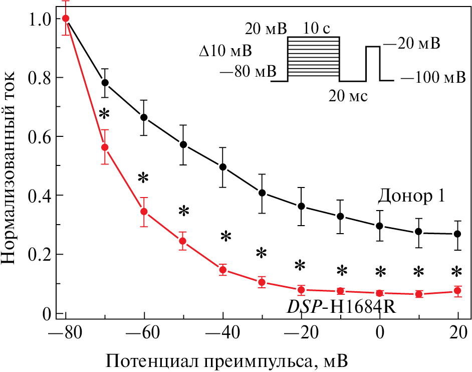Рис. 2. Усиление стационарной медленной инактивации на модели КМ-иПСК пациента с прогрессирующим нарушением сердечной проводимости и выраженными желудочковыми нарушениями ритма (DSP-H1684R, нижняя кривая, n = 5) по сравнению с данными, полученными на кардиомиоцитах от здорового донора (верхняя кривая, n = 9). * — различия достоверны при p < 0.05 (критерий Манна–Уитни). Здесь и на рис. 3, 4 показаны средние значения и их стандартные ошибки