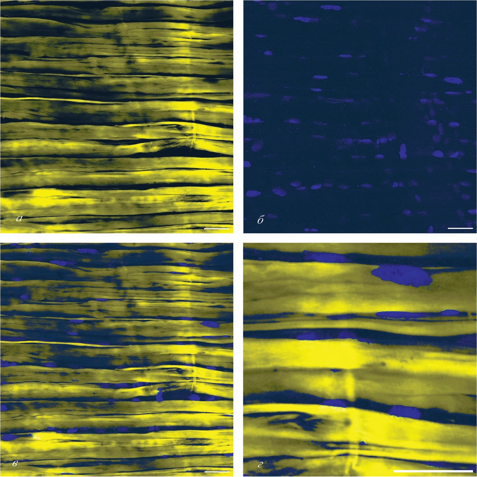 Рис. 2. Двойное окрашивание препарата соматических мышечных клеток дождевого червя на F-актин фаллоидином, меченым флуоресцентным красителем, и DAPI для выявления ядер клеток: а — окрашивание ТМР-фаллоидином; б — окрашивание DAPI; в — наложение изображений а и б; г — увеличенная область изображения в. Масштабная линейка: 20 мкм