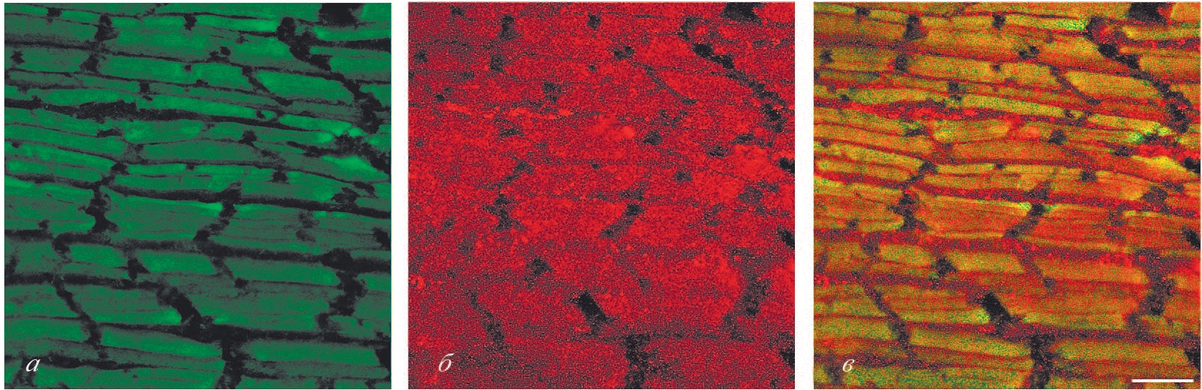 Рис. 3. Выявление быстрой и медленной изоформ тяжелых цепей миозина в препарате соматических мышечных клеток дождевого червя при двойном флуоресцентном окрашивании антителами: а — окрашивание антителами на быструю изоформу тяжелых цепей миозина (зеленый цвет); б — окрашивание антителами на медленную изоформу тяжелых цепей миозина (красный цвет); в — наложение изображений а и б. Масштабная линейка: 20 мкм