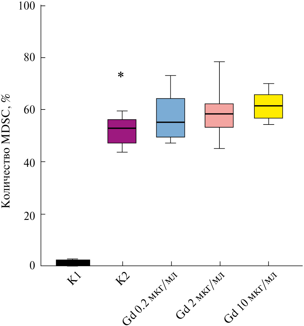 Рис. 1. Влияние гликоделина (Gd) разной концентрации на конверсию CD11b+-клеток (из мононуклеарных клеток периферической крови доноров) в фенотип MDSC. Представлены медианы, межквартильный диапазон (Q1–Q3, границы столбцов), минимальное и максимальное значения (вертикальные отрезки); по вертикали: доля живых Lin–HLA-DR‒-клеток в гейте; (К1 – контроль, без добавления цитокинов и гликоделина в среду культивирования, К2 – контроль 2, добавление в среду только цитокинов); различия достоверны при P < 0.05: (*) – между К1 и К2 (n = 7, критерий Фридмана).