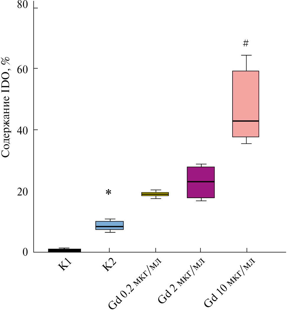 Рис. 2. Содержание индоламин-2,3-диоксигеназы (IDO) в клетках MDSC при использовании гликоделина (Gd) в разной концентрации. Представлены медианы, межквартильный диапазон (Q1–Q3), минимальное и максимальное значения; различия достоверны при P < 0.05 (критерий Фридмана): (*) – между контролем индукции (К1, культура без добавления цитокинов и Gd) и К2 (культура с добавлением цитокинов и без Gd); (#) – различия с К2.