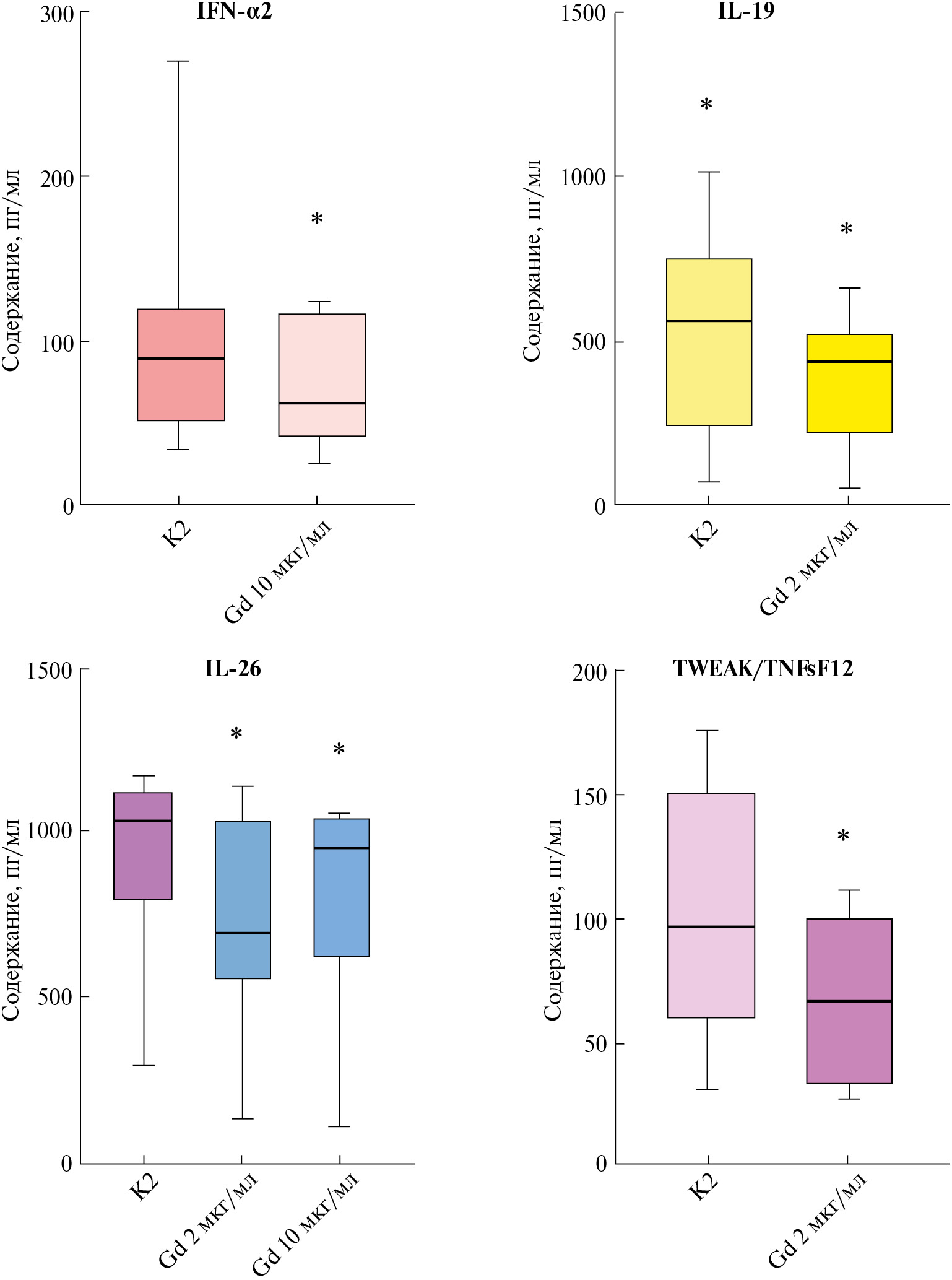 Рис. 3. Продукция цитокинов IFN-α2, IL-19, IL-26 и TWEAK/TNFsF12 клетками CD11b+, индуцированными в фенотип MDSC при использовании гликоделина (Gd) в разной концентрации. Показано содержание цитокинов в супернатантах культур MDSC. Представлены медианы, межквартильный диапазон (Q1–Q3, границы столбцов), минимальное и максимальное значения (вертикальные отрезки). (*) – различия медианных значений (n = 7) достоверны при P < 0.05 по сравнению с К2 (культура с добавлением цитокинов и без Gd; непараметрический критерий Фридмана).