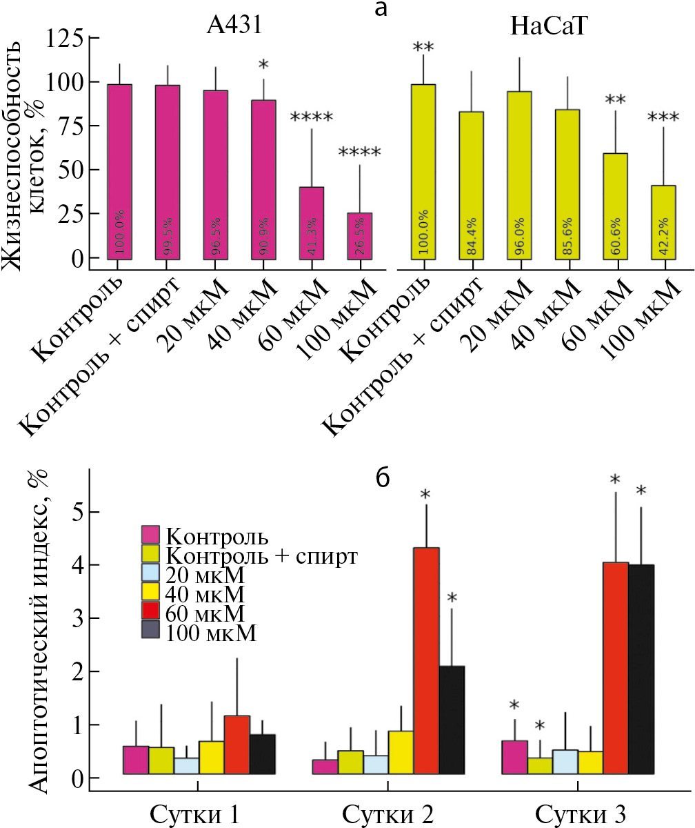 В более ранней работе (Савицкая и др., 2012) показано, что СВЕ вызывает снижение жизнеспособности и апоптотическую гибель клеток эпидермоидной карциномы А431 по сравнению с контролем; при этом эффект зависит от концентрации агента и времени воздействия. В иммортализованных нетуморогенных кератиноцитах НаСаТ СВЕ также вызывает снижение жизнеспособности клеток, и выраженность эффекта зависит от времени воздействия и концентрации вещества. Индукция апоптоза в клетках НаСаТ показана с помощью подсчета АИ на препаратах клеток, окрашенных гематоксилином и эозином. Примечательно, что хотя СВЕ, как и в клетках А431, вызывает значимое повышение АИ через 48 ч после внесения агента, даже при 60 и 100 мкМ СВЕ величина АИ не превышает 4%.