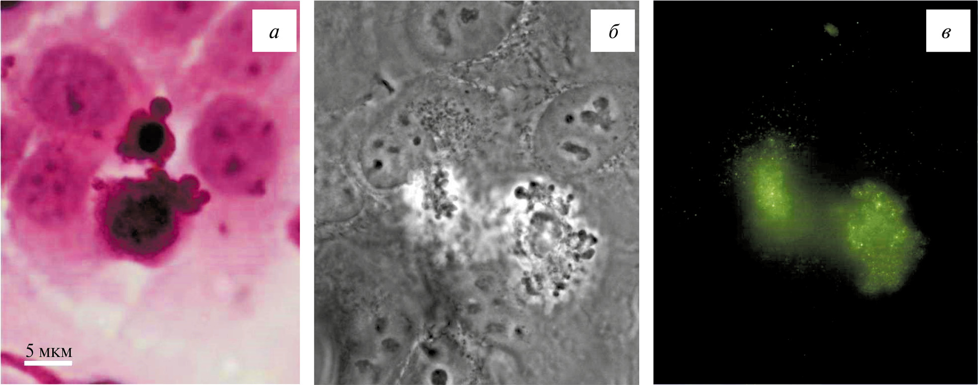 Рис. 2. Апоптоз в клетках НаСаТ при действии 60 мкМ СВЕ: а – окрашивание гематоксилином и эозином; б, в – соответственно фазовый контраст и иммуноцитохимическое выявление каспазы 3 в одной и той же клетке. Показан репрезентативный результат из трех независимых экспериментов.