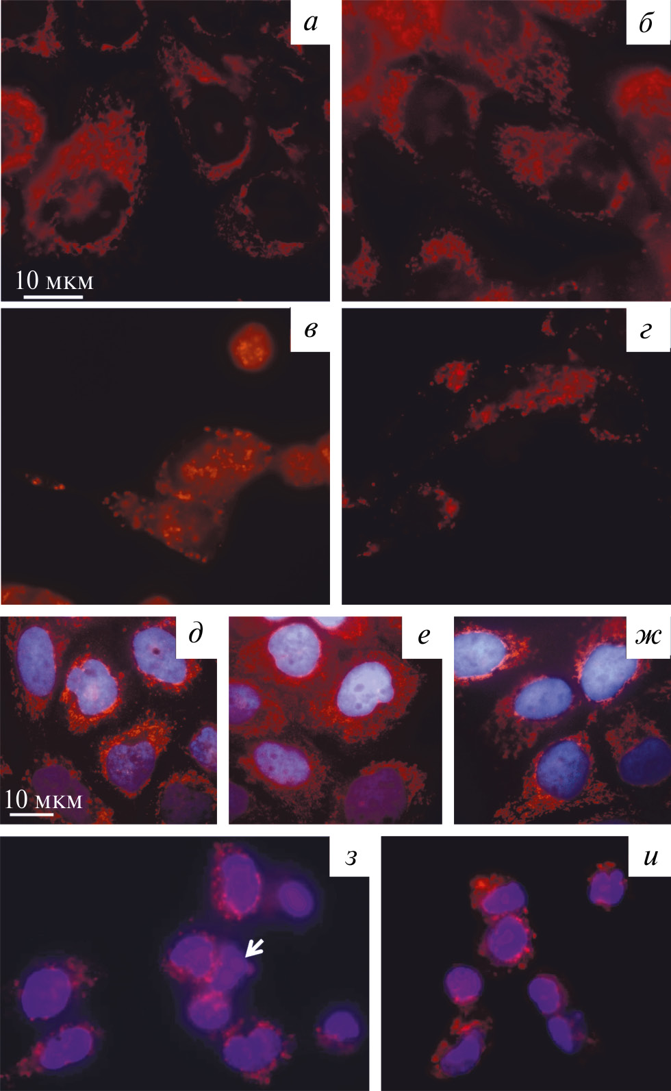 Рис. 3. Митохондрии в клетках линии НаСаТ после воздействия СВЕ в течение 48 ч: а–г – митохондрии в клетках НаСаТ, окрашенные MitoTracker Orange в контроле (а) и после действия СВЕ в концентрации 40 (б), 60 (в) и 100 (г) мкМ; д–и – иммуноцитохимическое выявление цитохрома с в клетках НаСаТ в контроле без спирта (д) и с добавлением его (е), а также после действия СВЕ в концентрации 40 (ж), 60 (з) и 100 (и) мкМ. Показан репрезентативный результат из трех независимых экспериментов.
