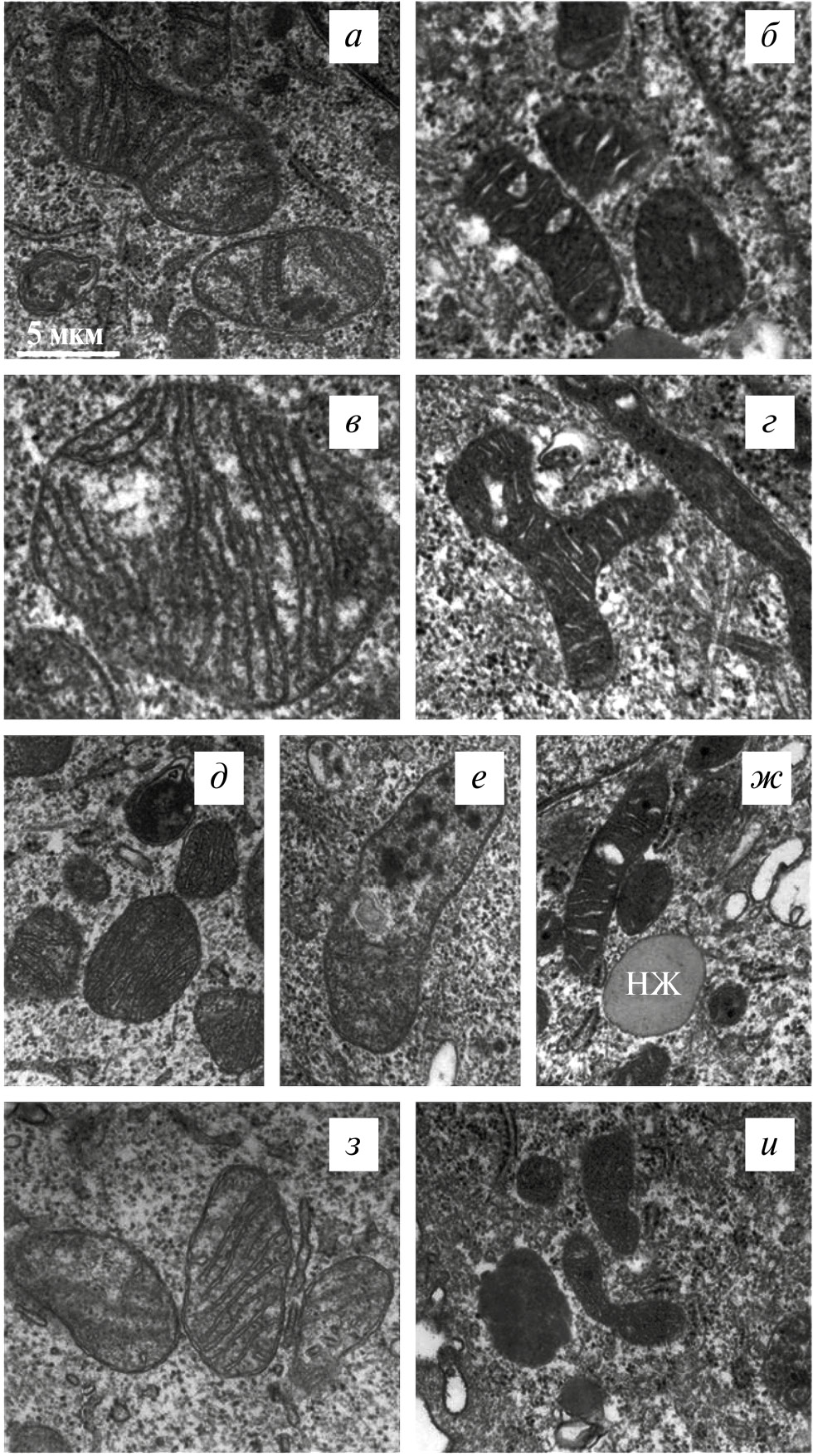 Рис. 4. Ультраструктура митохондрий в клетках НаСаТ в контроле (а, б) и после действия СВЕ в течение 48 ч в концентрации 40 (в, г), 60 (д–ж) и 100 (з–и) мкМ; нж – липидные включения (нейтральный жир).