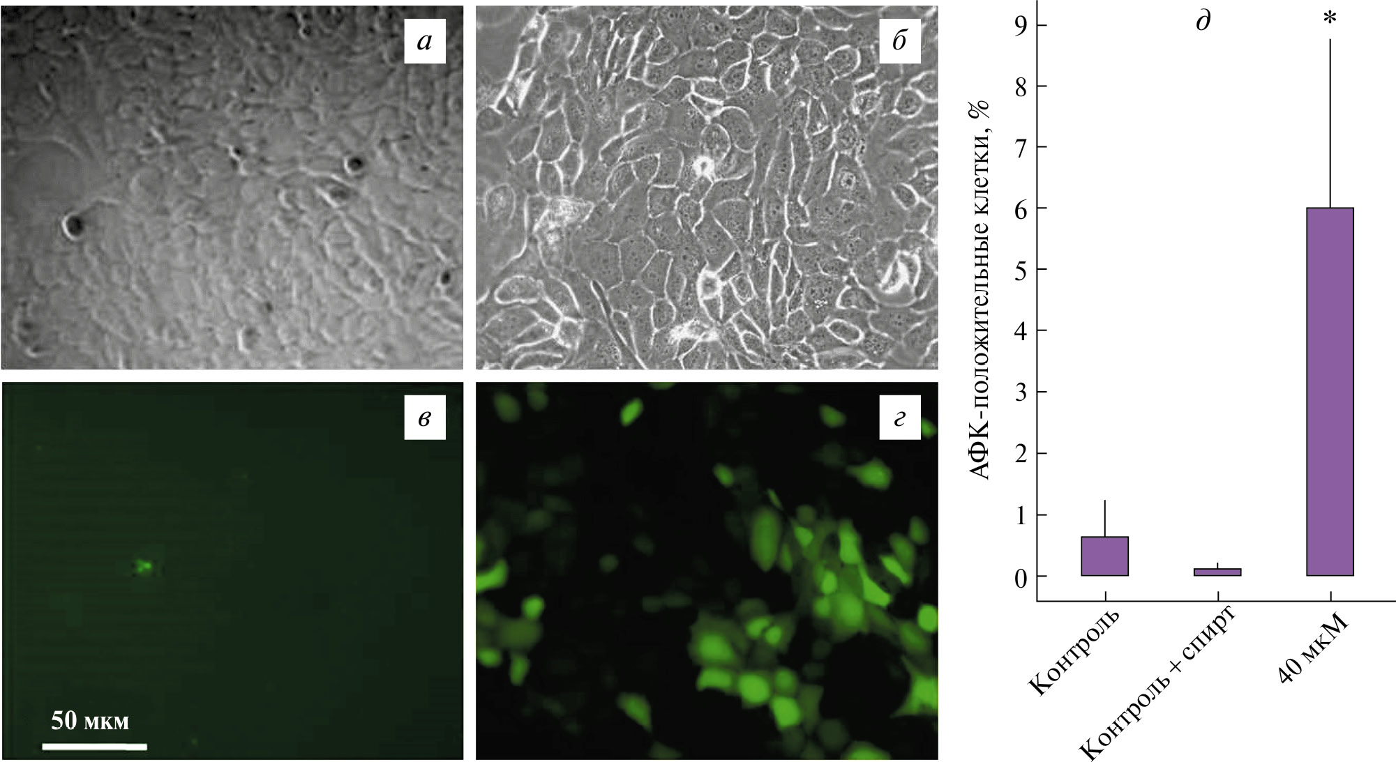 Рис. 5. Прижизненное выявление пероксида водорода в клетках НаСаТ в контроле (а, в) и после действия 40 мкМ СВЕ в течение 48 ч (б, г); фазовый контраст (а, б) и окрашивание с помощью зонда DCFH-DA (в, г); д – доля АФК-положительных клеток после культивирования при наличии СВЕ. Данные представлены в виде среднего значения и стандартного отклонения; тест Манна–Уитни, различие с контролем с добавлением спирта, достоверно при (*) P < 0.05 (n = 3).
