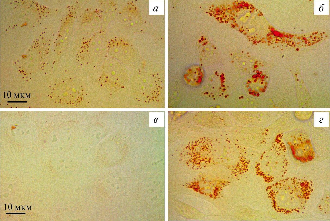 Рис. 6. Выявление нейтрального жира в клетках А431 (а, б) и НаСаТ (в, г) после культивирования в контроле (а, в) и в присутствии 40 мкМ СВЕ (б, г).