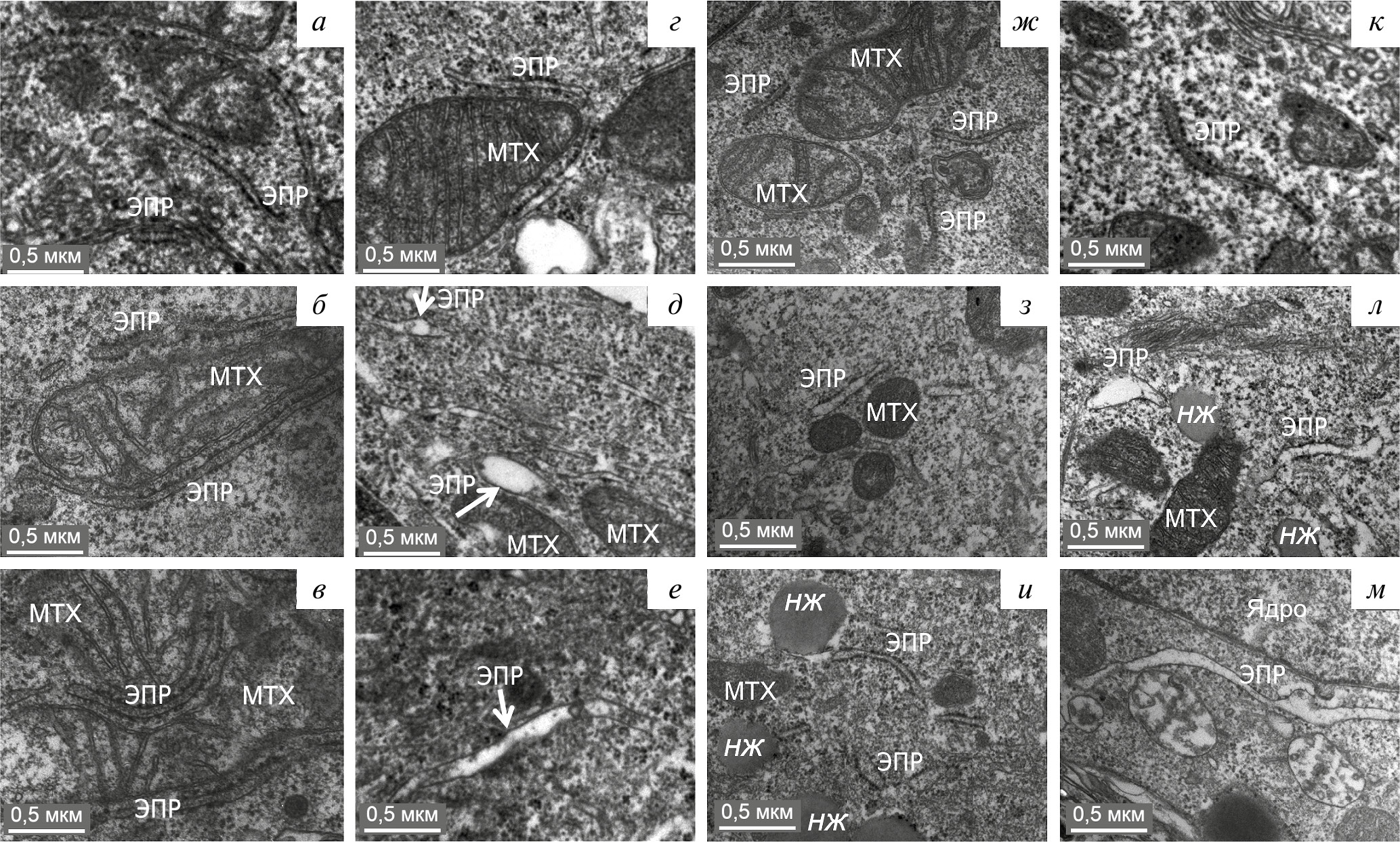 Рис. 7. Ультраструктура гранулярного ЭПР в клетках А431 (а–е) и НаСаТ (ж–м) в контроле и после 48-часового воздействия СВЕ. Клетки А431: а – контроль; б, в – контроль с добавлением спирта; г–е – 40 мкМ СВЕ. Клетки НаСаТ: ж – контроль, з – 40 мкМ СВЕ, и, к – 60 мкМ СВЕ, л, м – 100 мкМ СВЕ. Обозначения: ЭПР – эндоплазматический ретикулум, МТХ – митохондрии, НЖ – липидные капли (нейтральный жир).