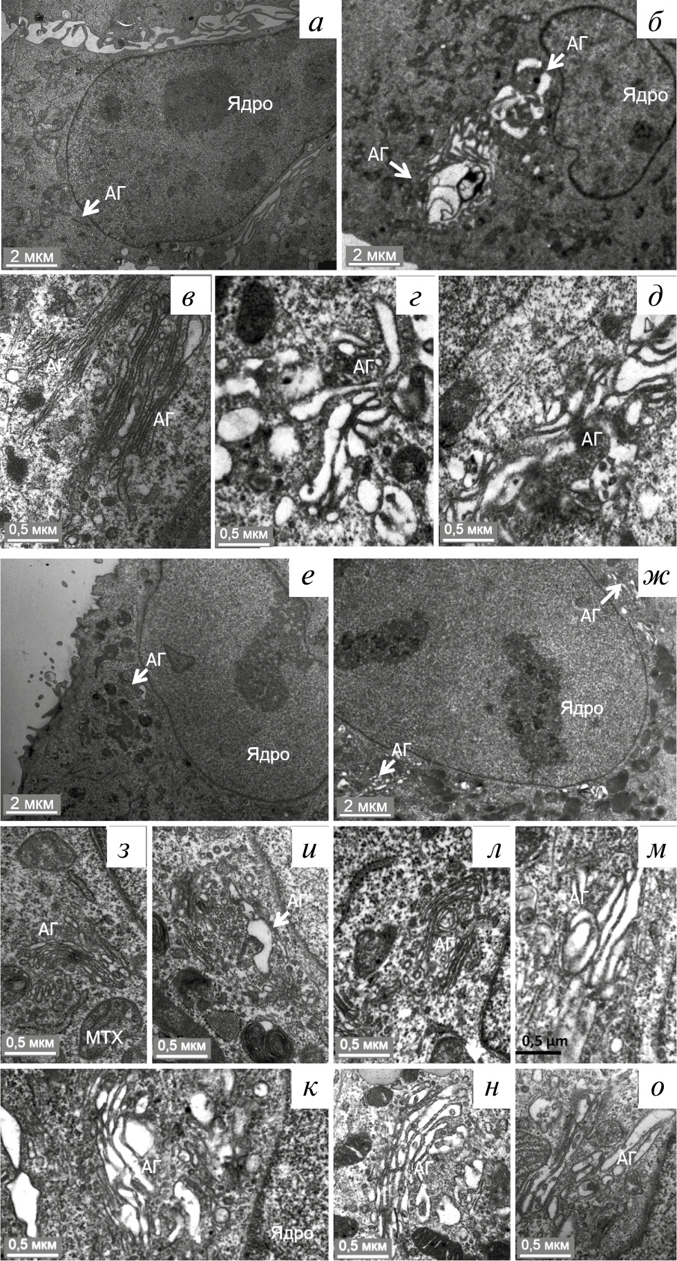 Рис. 9. Ультраструктура аппарата Гольджи в клетках А431 (а–д) и НаСаТ (е–о) в контроле и после 48-часового действия СВЕ. Клетки А431: а, в – контроль; б, г, д – 40 мкМ СВЕ. Клетки НаСаТ: е, з, и, к – контроль; ж, н – 60 мкМ СВЕ; л, м – 40 мкМ СВЕ; о – 100 мкМ СВЕ. Обозначения: АГ – аппарат Гольджи, МТХ – митохондрии.
