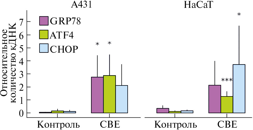 Рис. 10. Относительная экспрессия генов-маркеров стресса ЭПР: GRP78, ATF4 и CHOP в клетках линий А431 и НаСаТ при воздействии 40 мкМ СВЕ. ПЦР в реальном времени. Данные представлены в виде среднего значения и стандартного отклонения; тест Манна–Уитни; различия с контролем достоверны при (*) P < 0.05 или (***) P < 0.001 (n = 3).