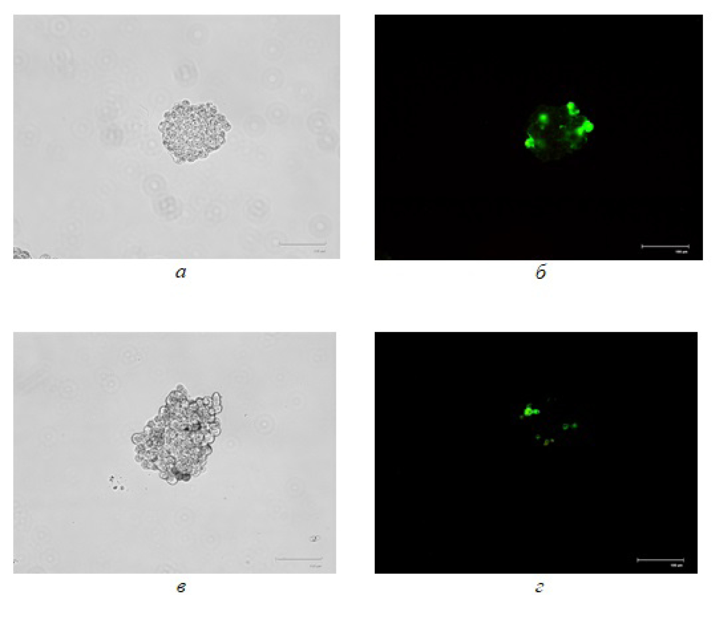 Определение уровня апоптоза в монослое и сфероидах. Для оценки уровня апоптоза в монослое использовали набор AnnexinV-FITC Apoptosis Kit (FineTest, США). Согласно протоколу производителя, в каждую лунку вносили 195 мкл 1-кратного связующего буфера, 5 мкл аннексина, 10 мкл йодистого пропидия (PI) и инкубировали при комнатной температуре в темноте 1٠ мин. После инкубации удаляли смесь из лунок, добавляли 15%-ный раствор формалина и инкубировали 2٠ мин при комнатной температуре тоже в темноте. Затем аккуратно промывали 3٠٠ мкл PBS 2 раза. Далее в лунки добавляли 1٠٠ мкл PBS. Флуоресценцию оценивали в системе визуализации Floid с помощью зеленого светофильтра для аннексина и красного светофильтра для PI.