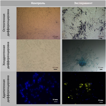 Для подтверждения биологической активности выделенных клеток проводили дифференцировку в трех направлениях (остеогенном, хондрогенном и адипогенном) по методике, описанной ранее (Закирова и др. 2021). Далее клетки фиксировали и результаты дифференцировки визуализировали с помощью инвертированного микроскопа AxioObserver Z1 (Carl Zeiss, Германия).